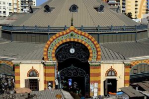 Un marché à l’architecture coloniale où les étals de fruits, légumes, épices, artisanat et produits locaux s’entremêlent dans une ambiance colorée et vivante.